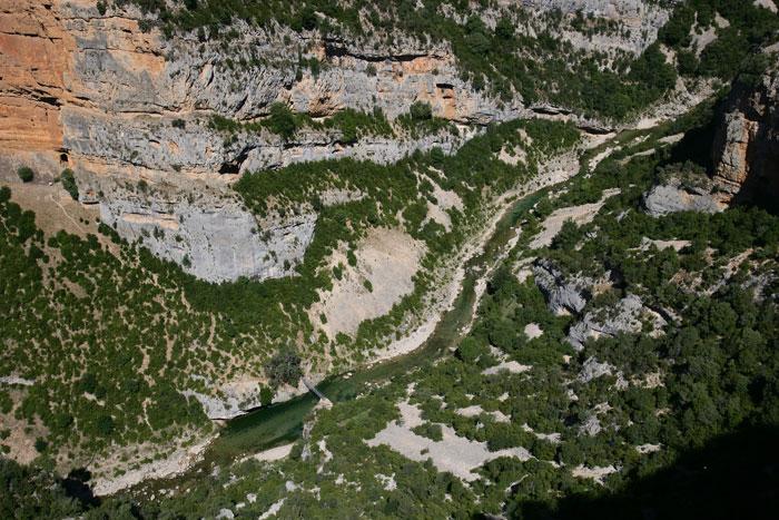 Sería recomendable acercarnos por la derecha para contemplar el Alcanadre desde un impresionante farallón rocoso en cuya base divisamos la ermita de San Martin.