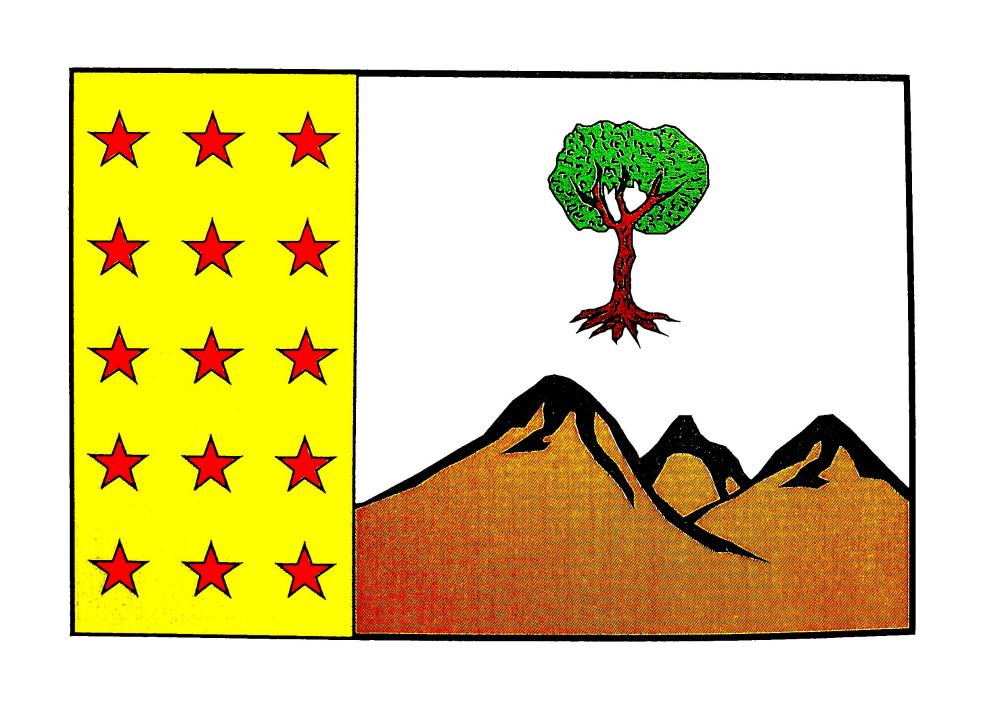Por último, el centro de la punta del escudo y en la parte inferior del paño de la bandera, se muestra el perfil de unas montañas que representan al Parque Natural de la Sierra y los Cañones de Guara.