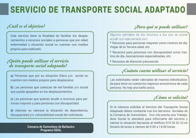 Si te interesa solicitar el Servicio del Transporte Social Adaptado debes contactar con los Servicios Sociales de la Comarca de Somontano. Con cita previa, una trabajadora social te atenderá para informarte del servicio y valorar la situación llamando al teléfono 974 30 63 32 en horario de lunes a viernes de 9horas a 14horas